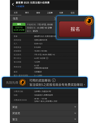 玩家在赛事的第5盲注级别以前报名都有机会获得奖励筹码。